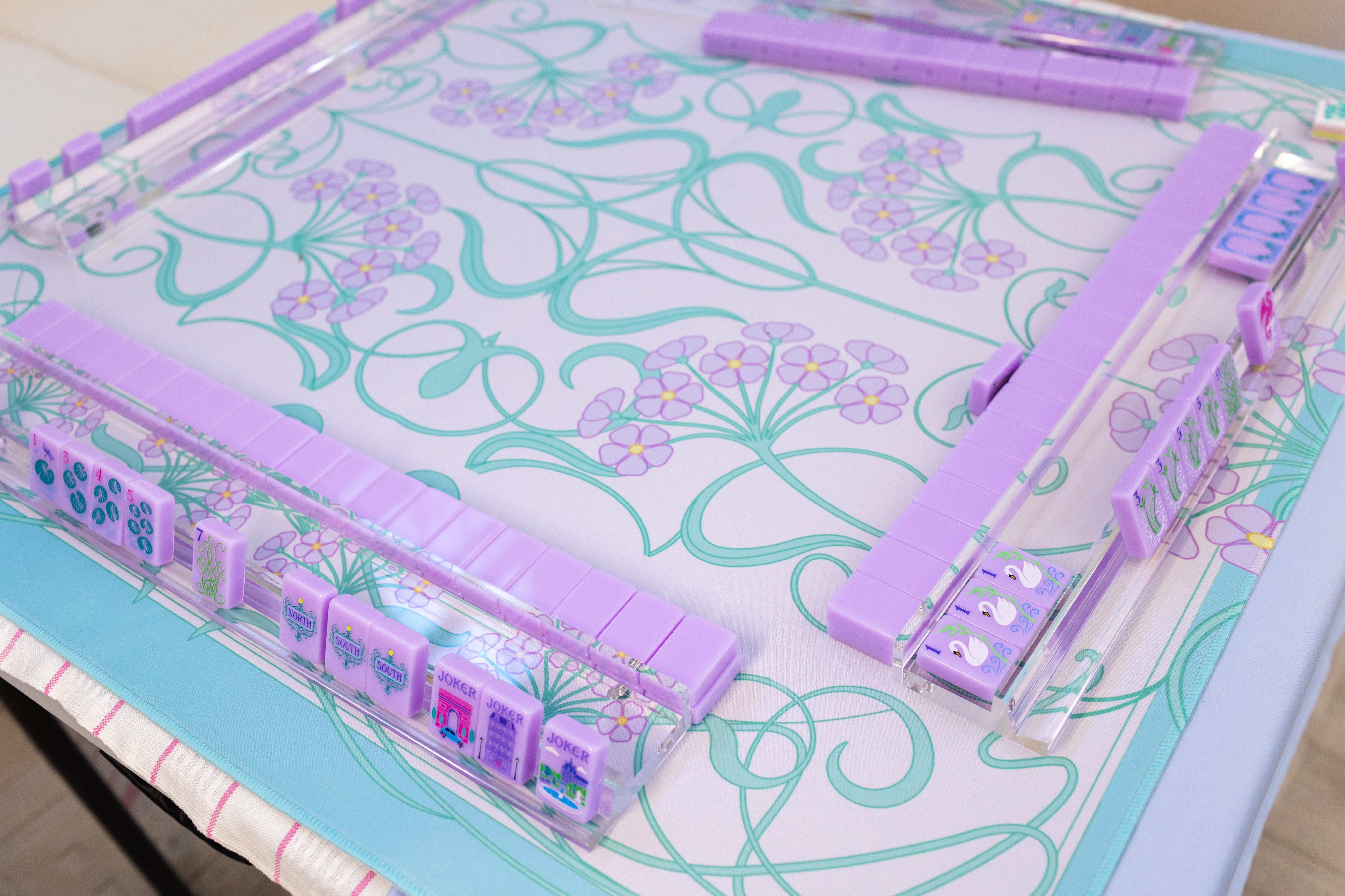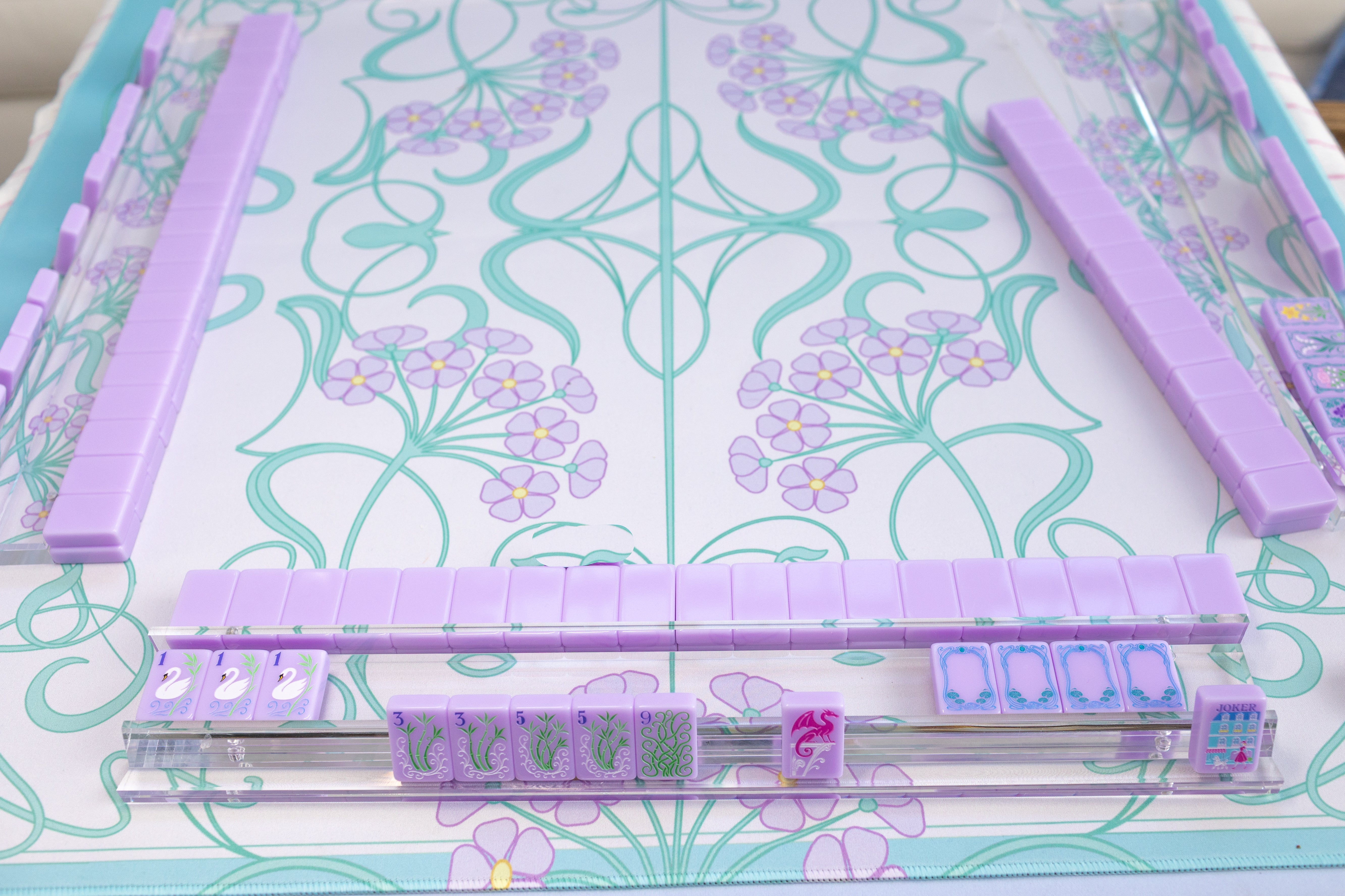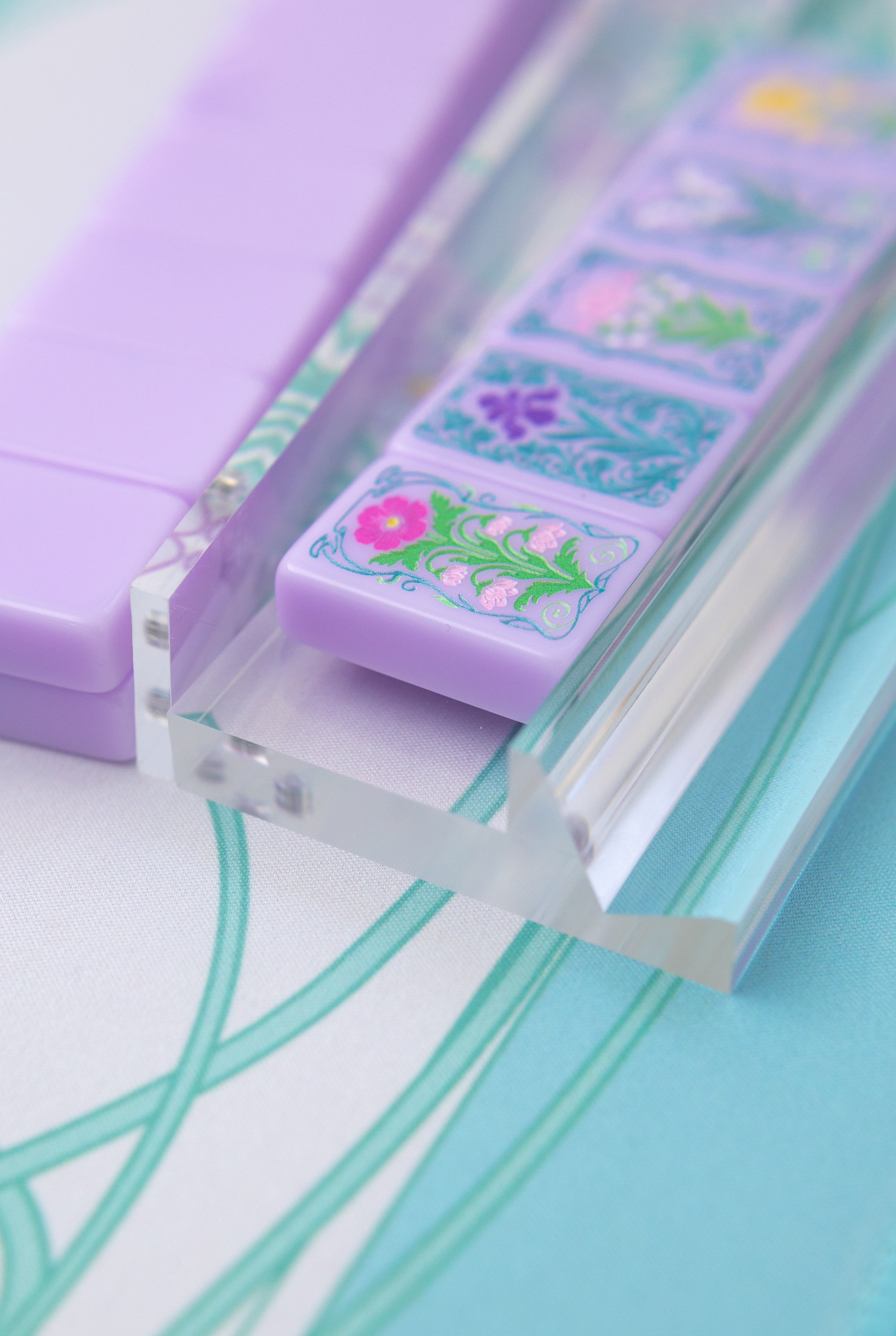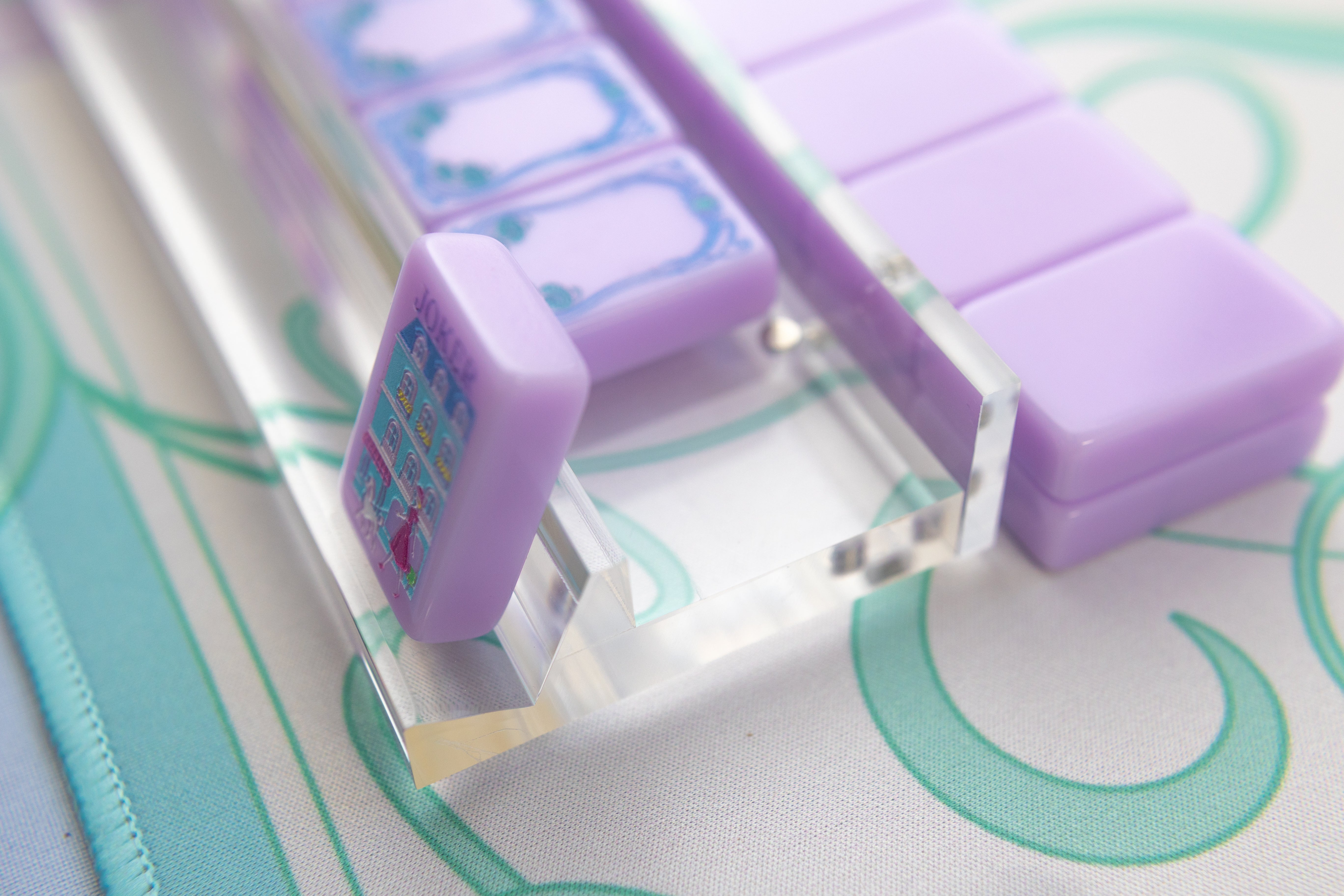 Their crystal-clear transparency lets your mahjong mat take center stage — think of them as the jewelry that complements the outfit. Whether your mat is pastel, tropical, Parisian, or coastal, these racks allow the design beneath to shine through with stunning clarity.