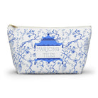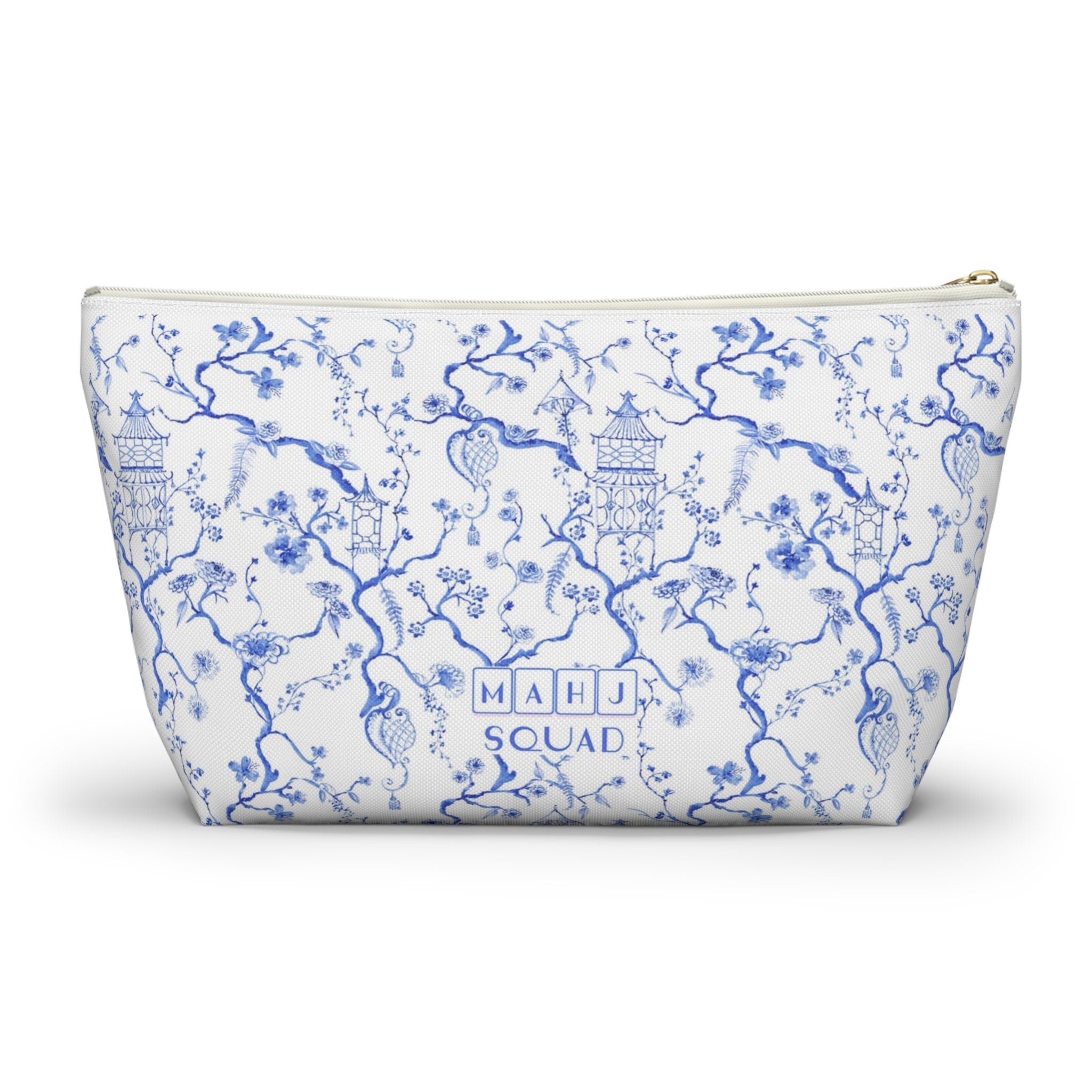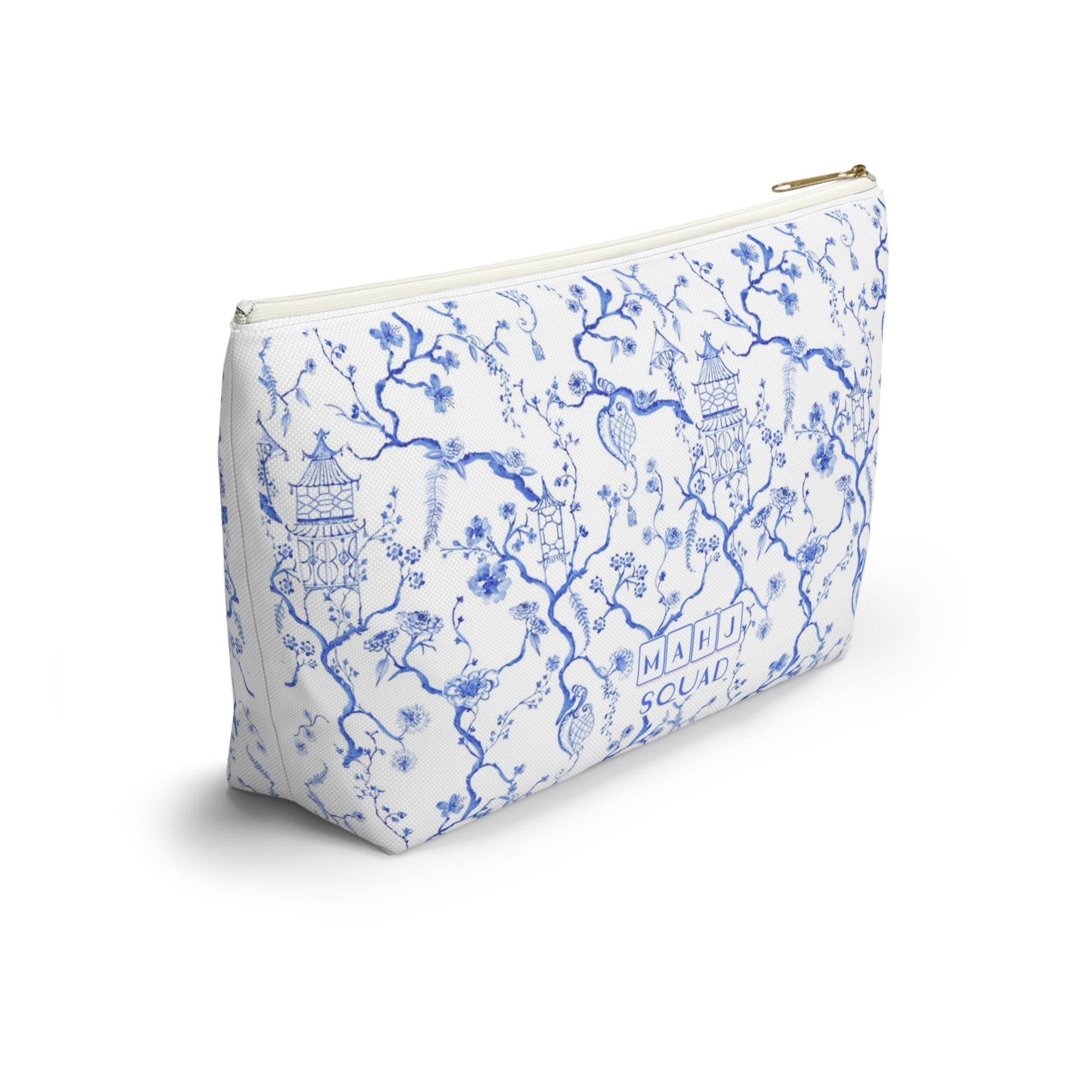 This blue and white t-bottom tile bag goes perfectly with our Chinoiserie Mahjong Collection. This pouch features a classic blue and white Chinoiserie floral print with pagodas. Large enough to fit the large tiles ;) 12x7x3