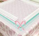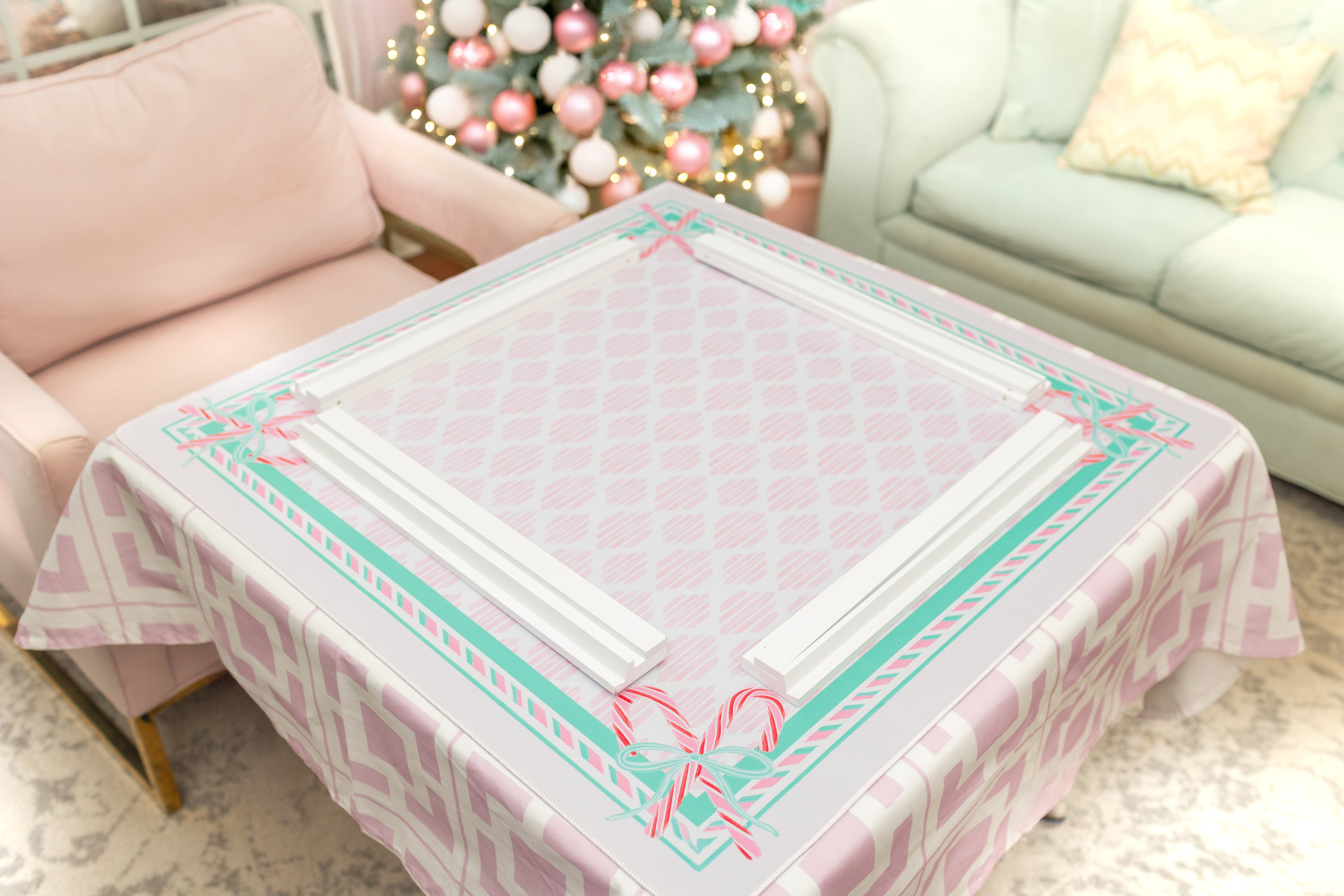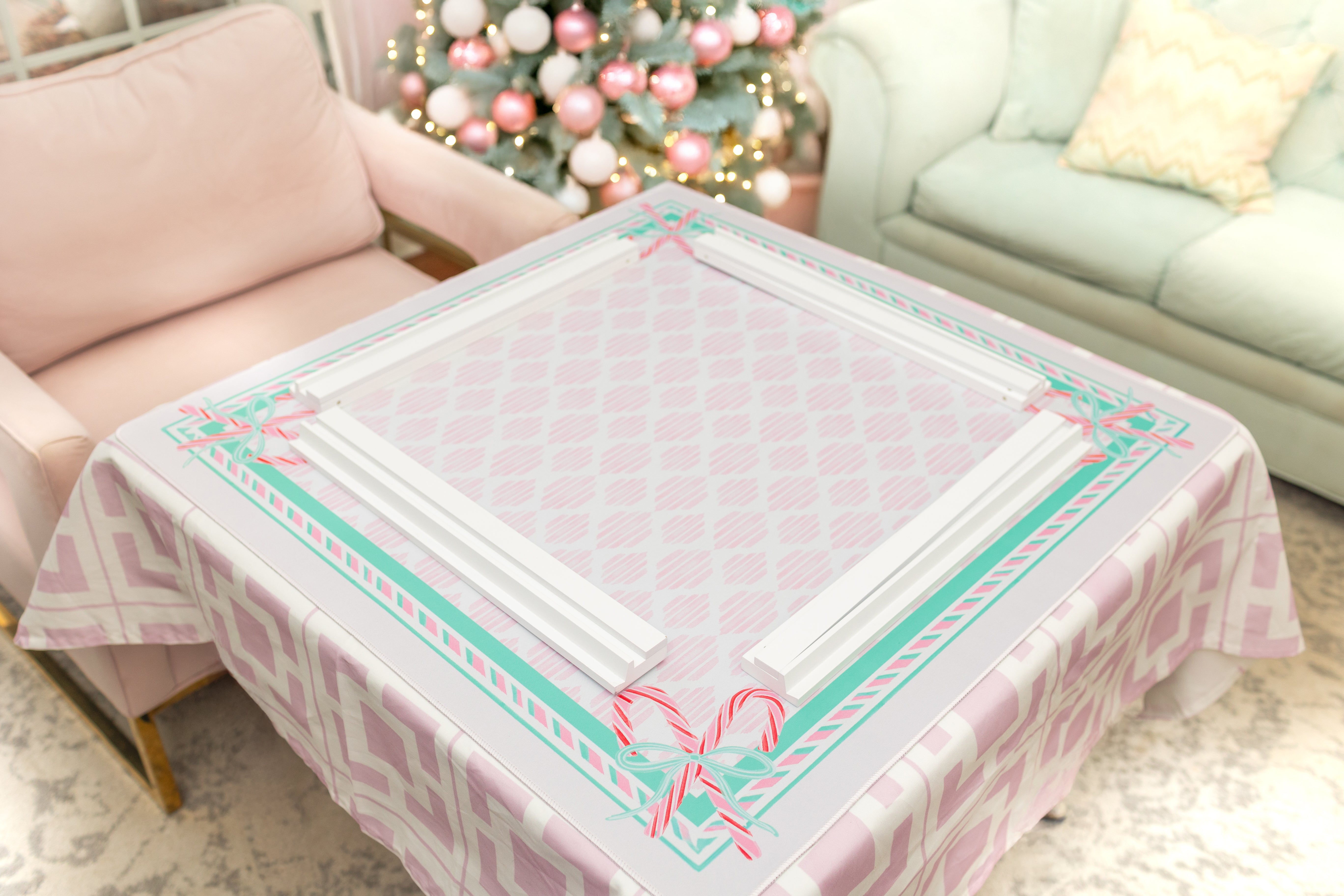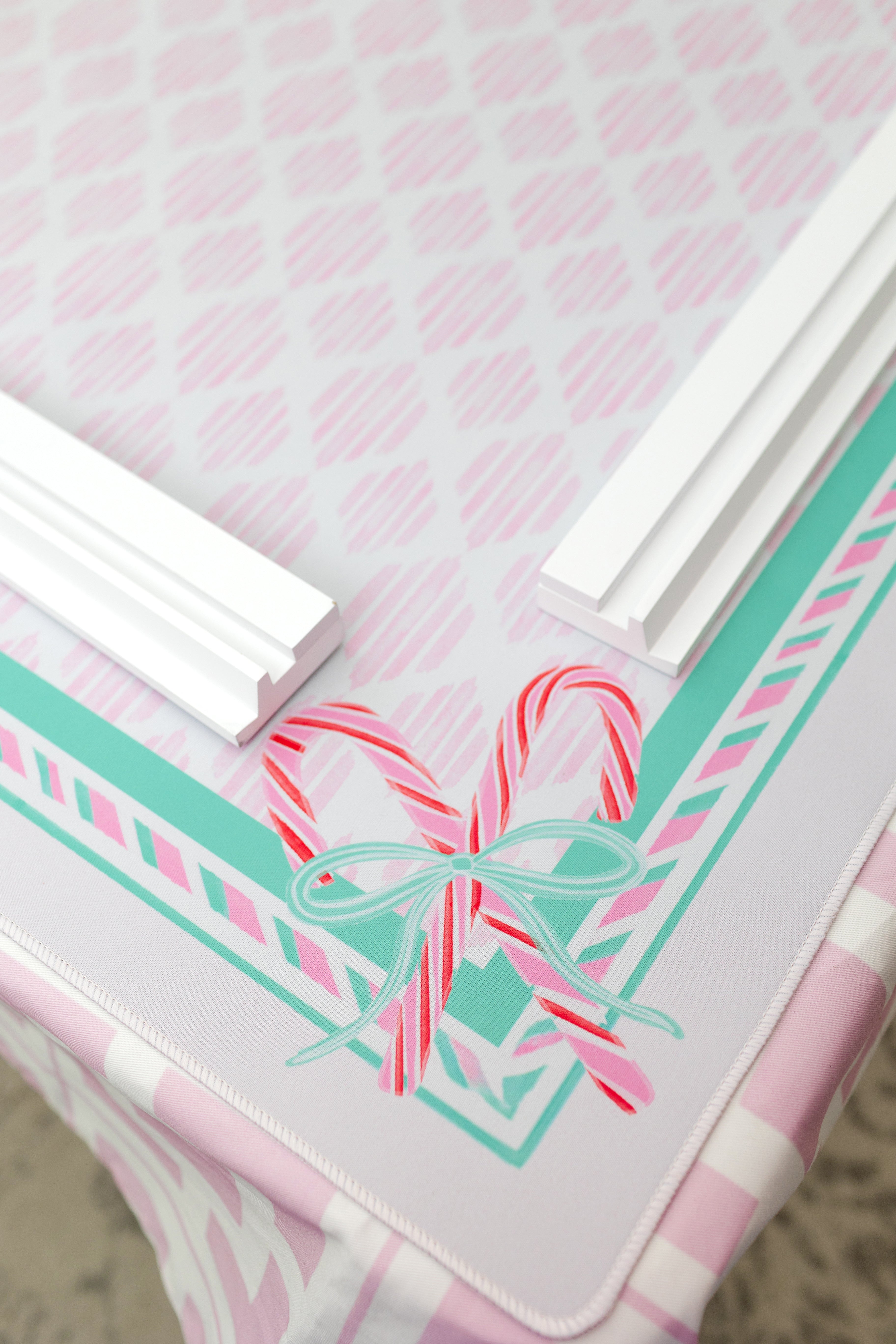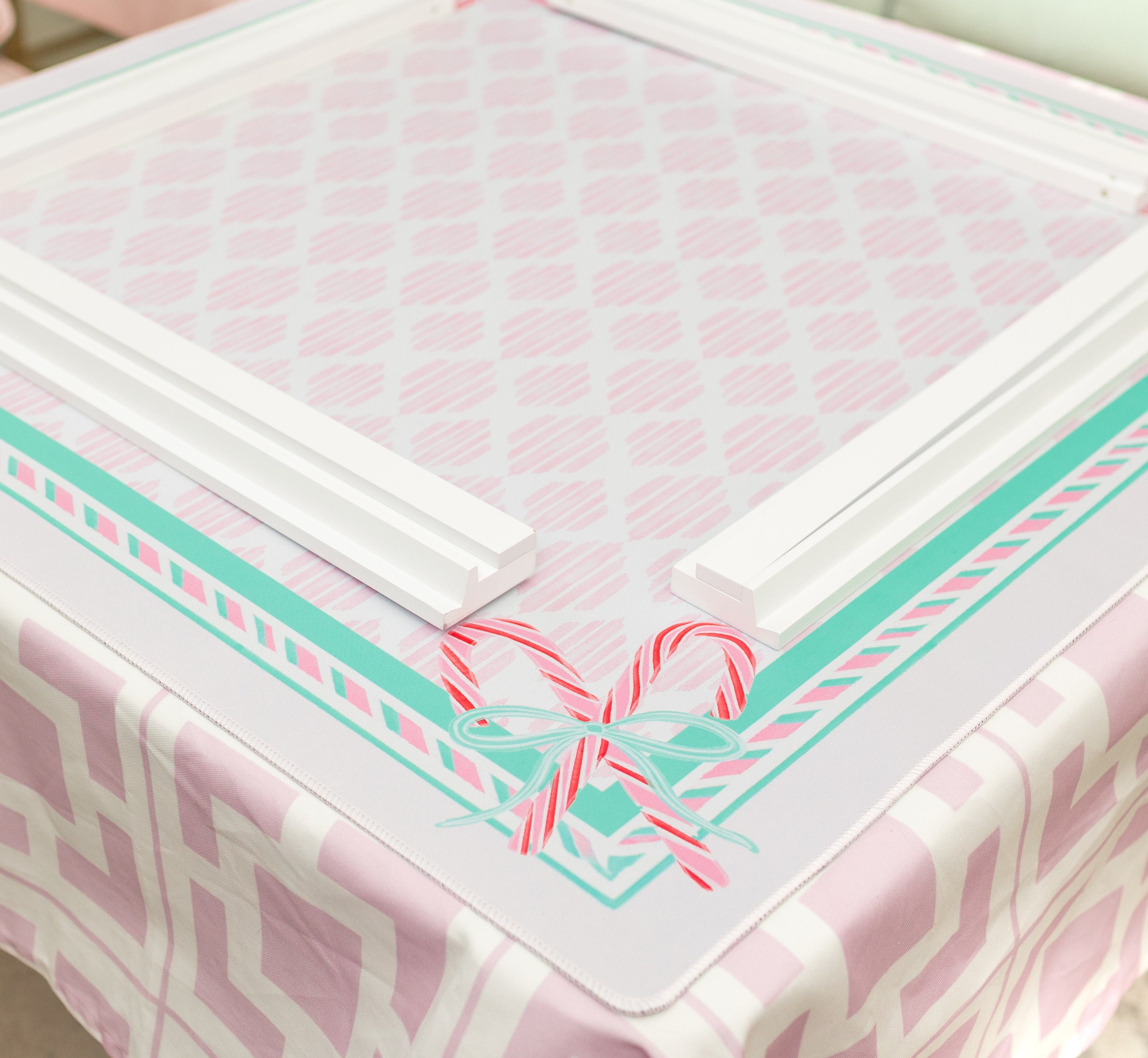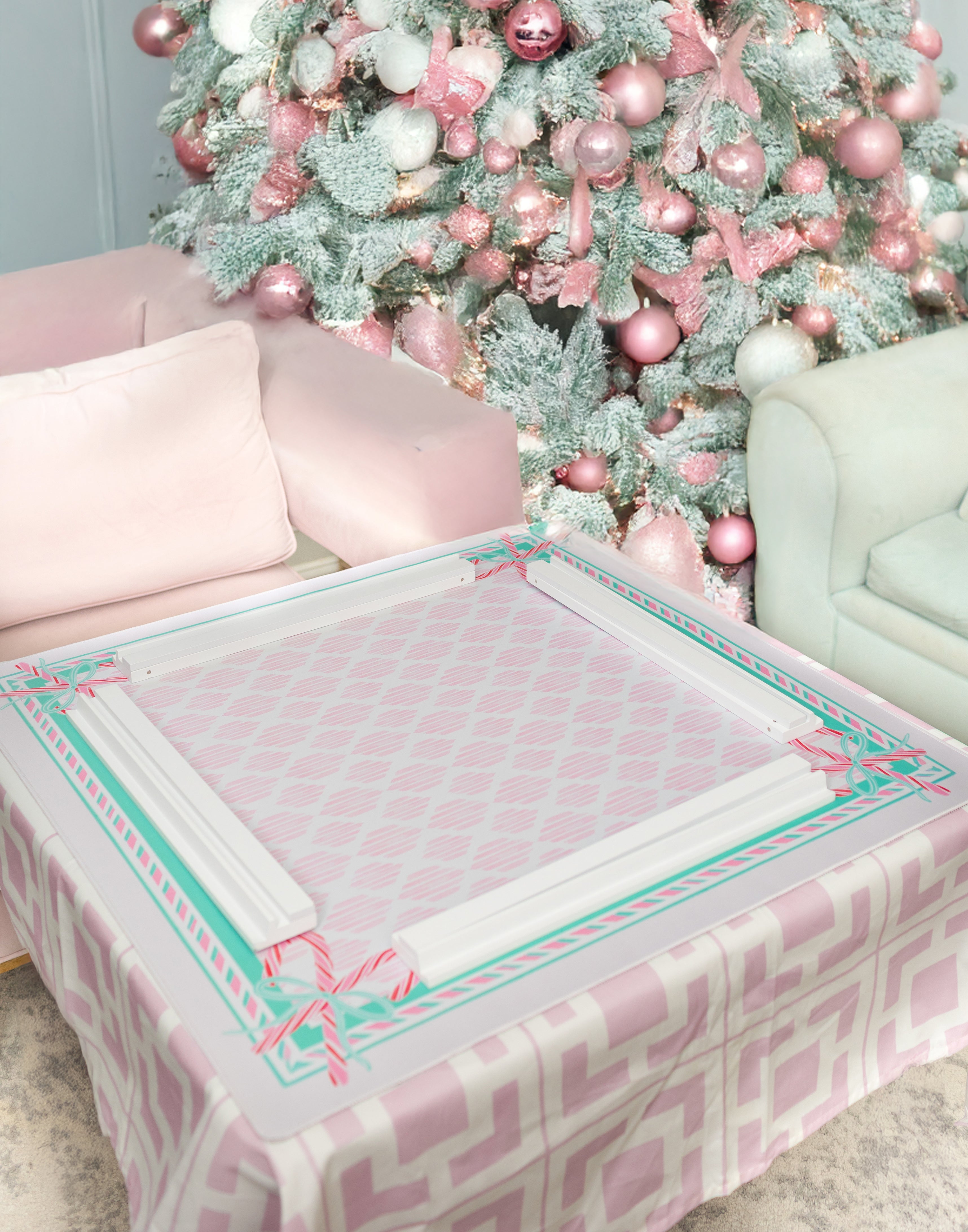 This Christmas wonderland mahj mat features a pink, red and mint color scheme with festive candy canes in eat corner. The center is a light pink ikat pattern with pink and mint candy cane borders.