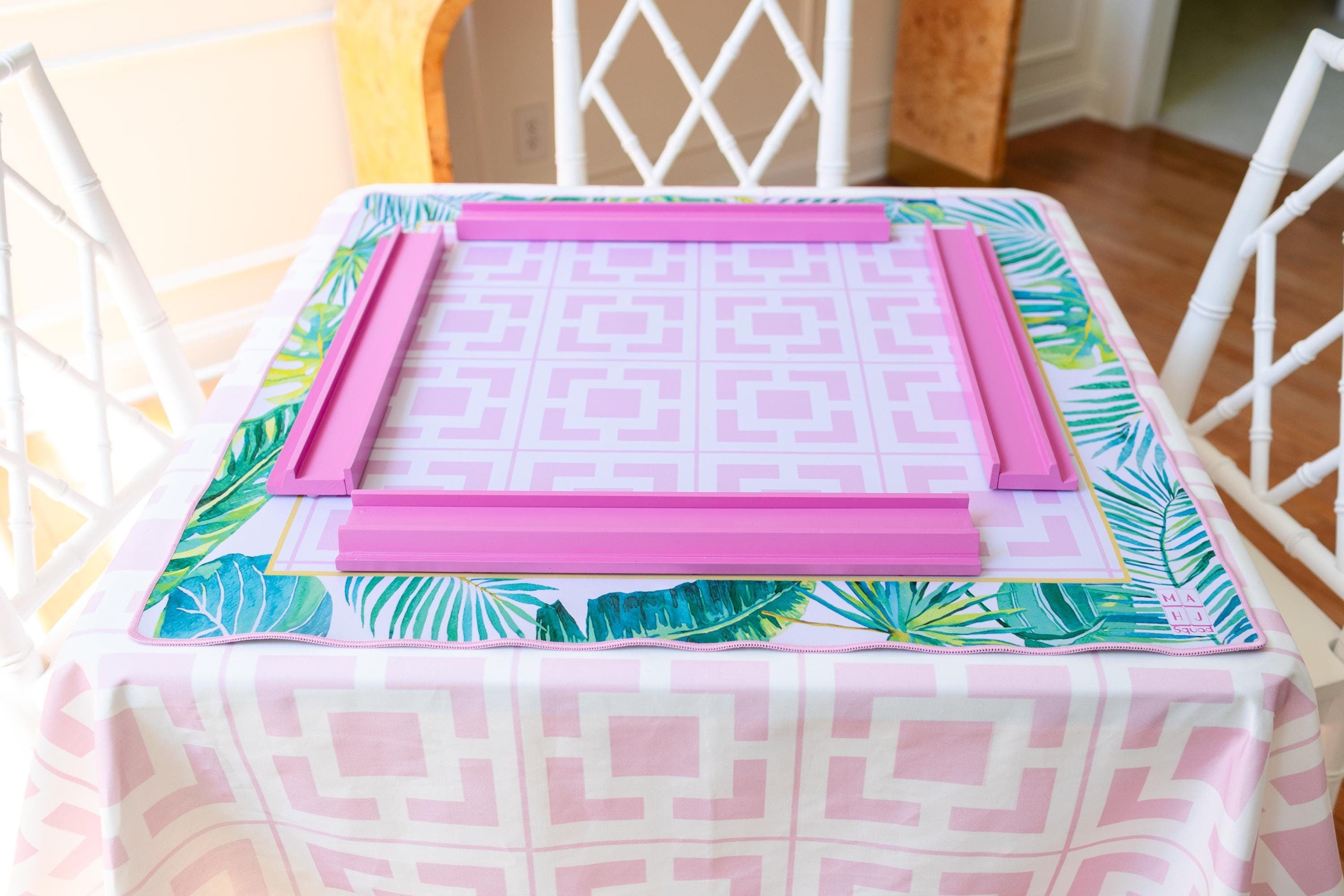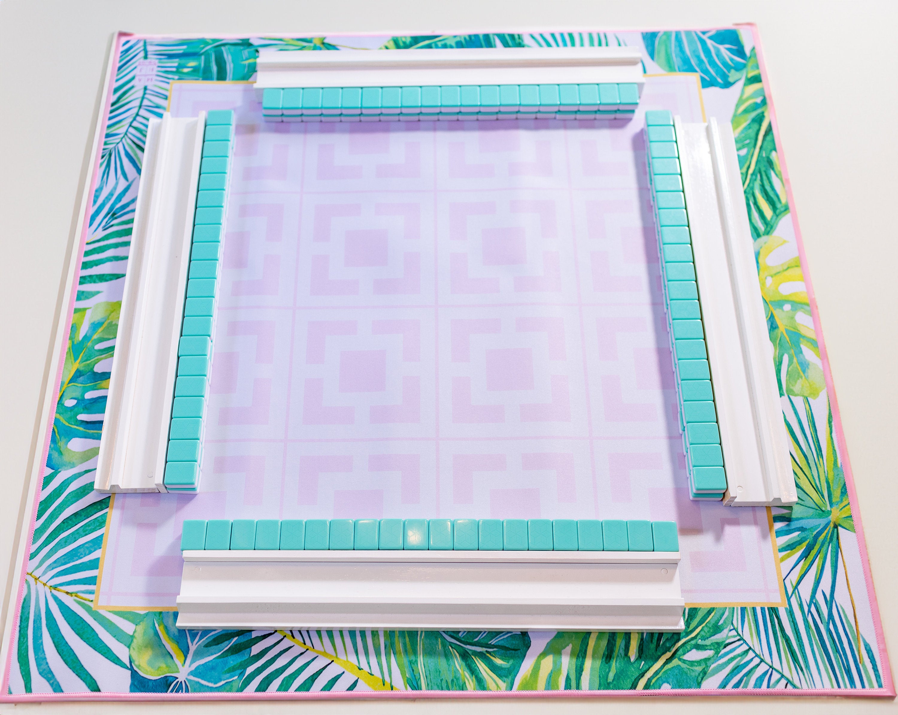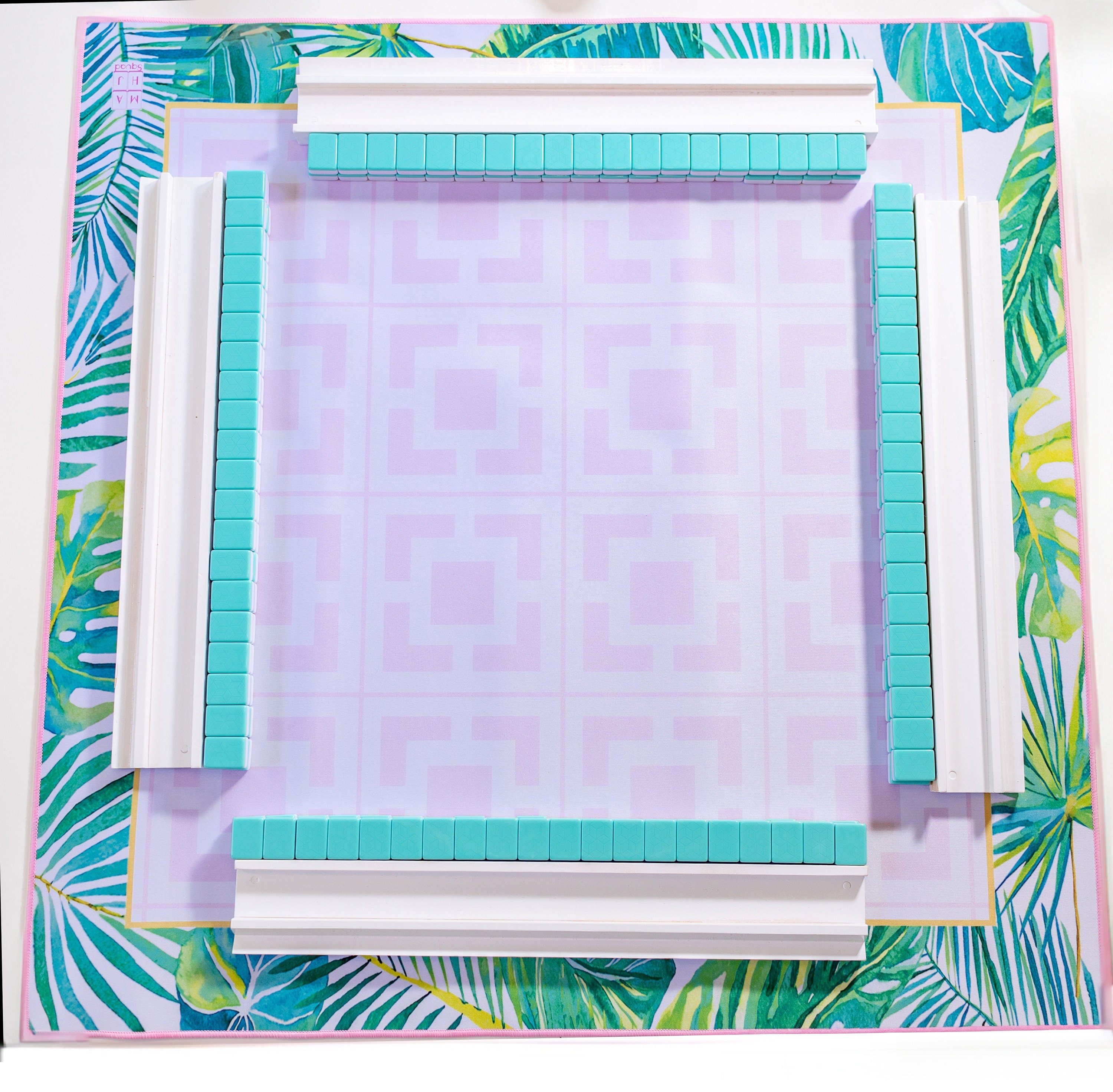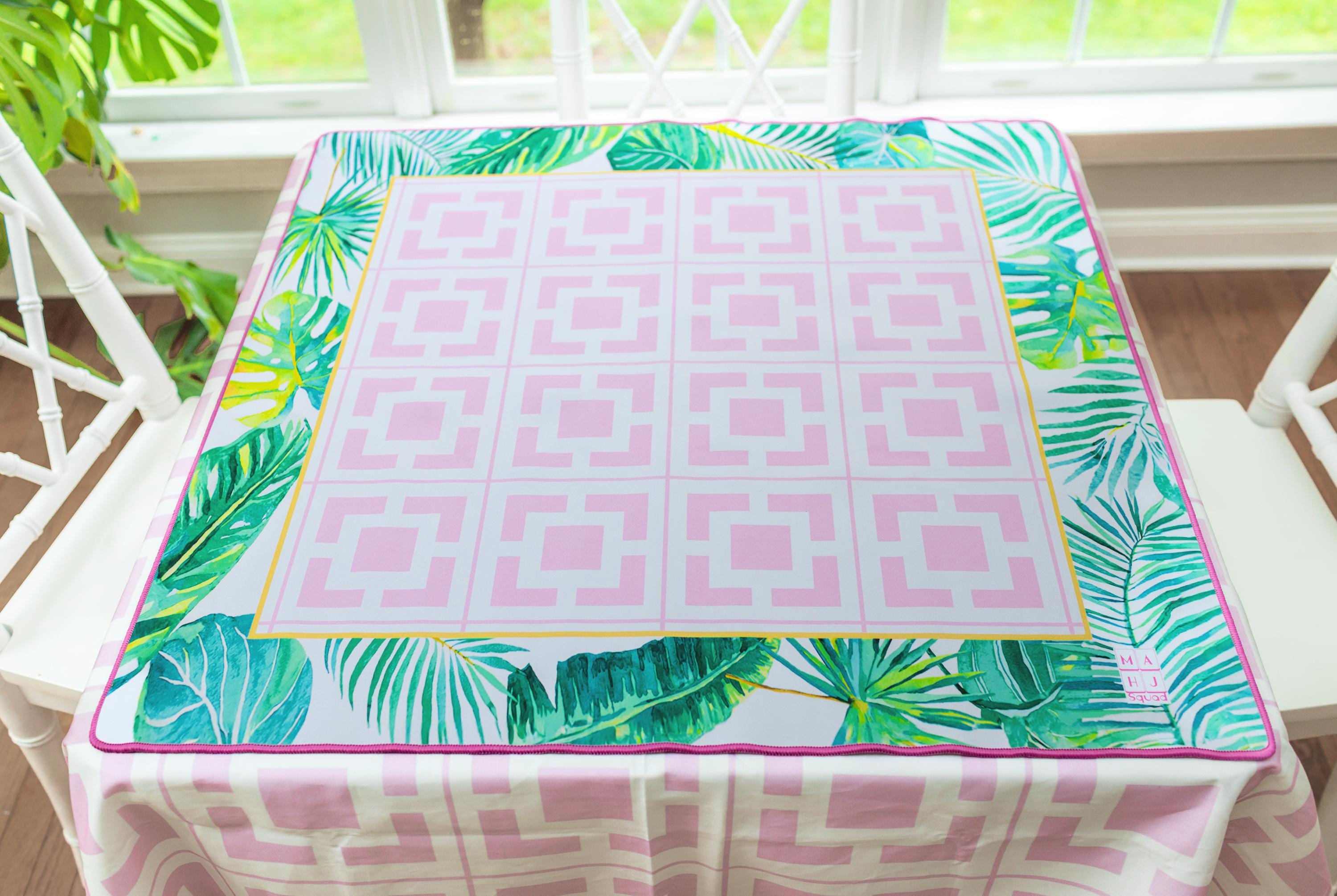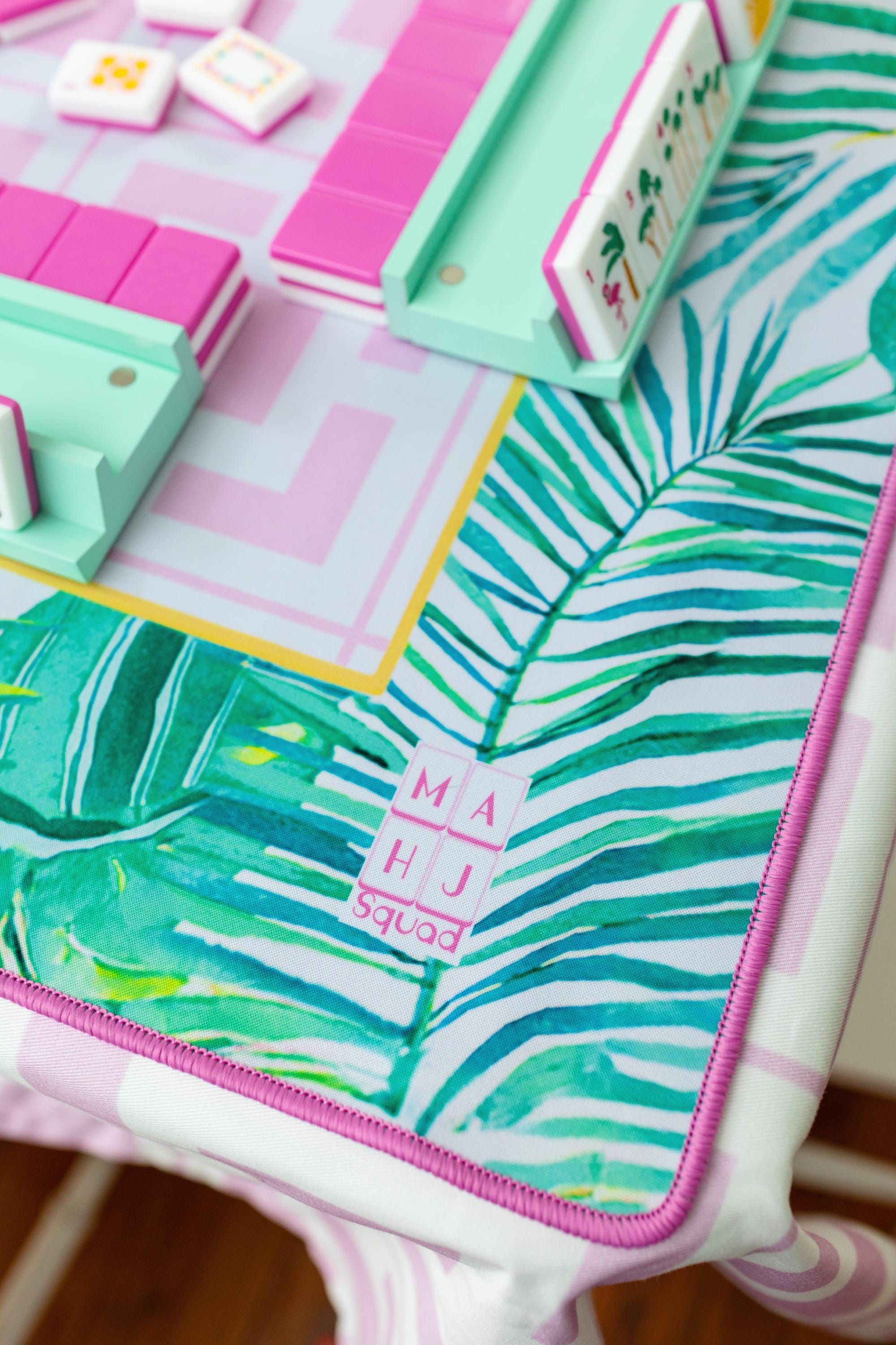 Have your Mahjong Mat reflect your personal style! This style is part of the Palm Springs collection reflecting the tropical mid-century style of Palm Springs, California. The center is reminiscent of the geometric patterns of the Parker Palm Springs architecture, and the border is a variety of tropical palms and monsteras. Edge stitching will be in a bright fun pink.