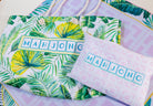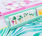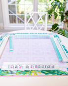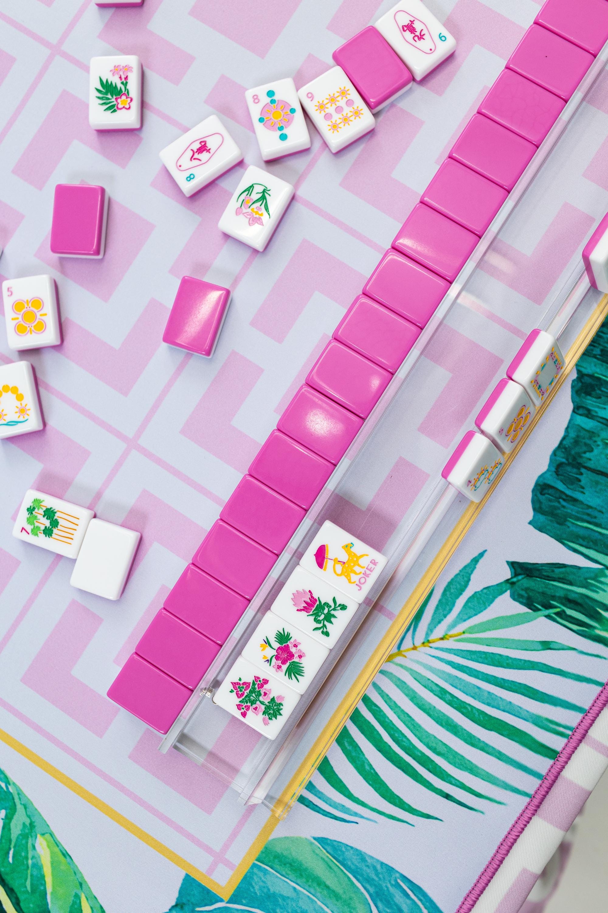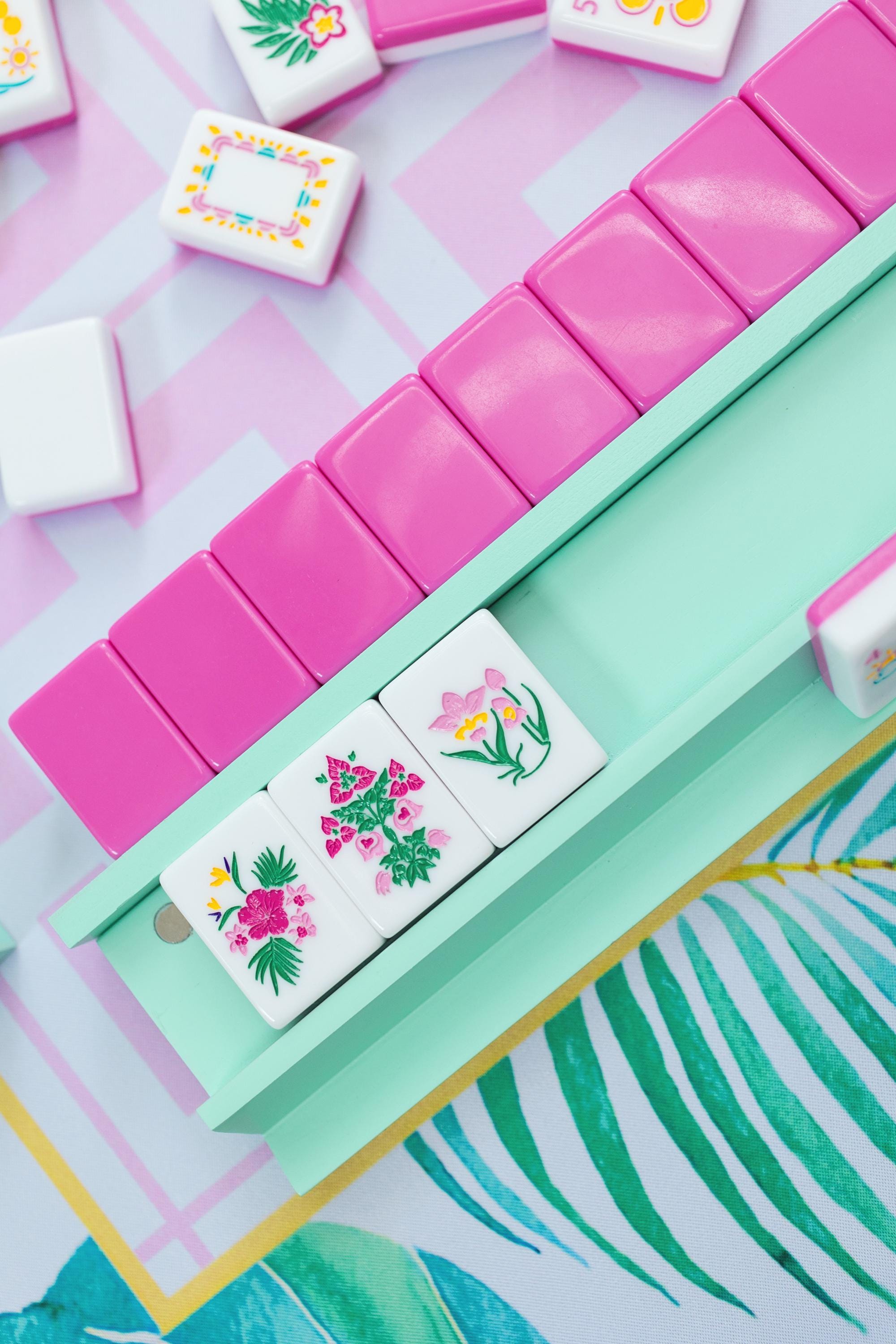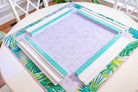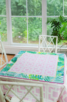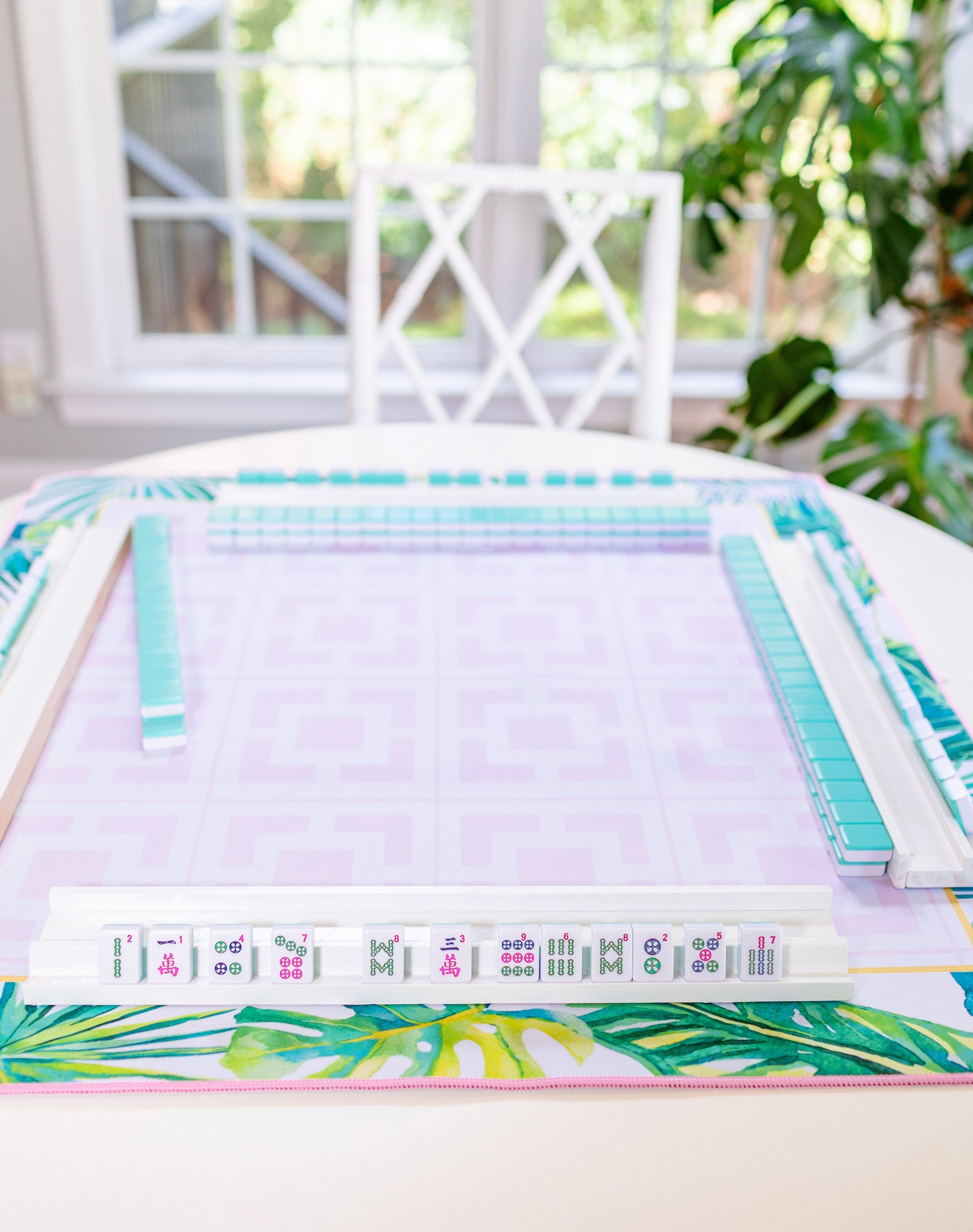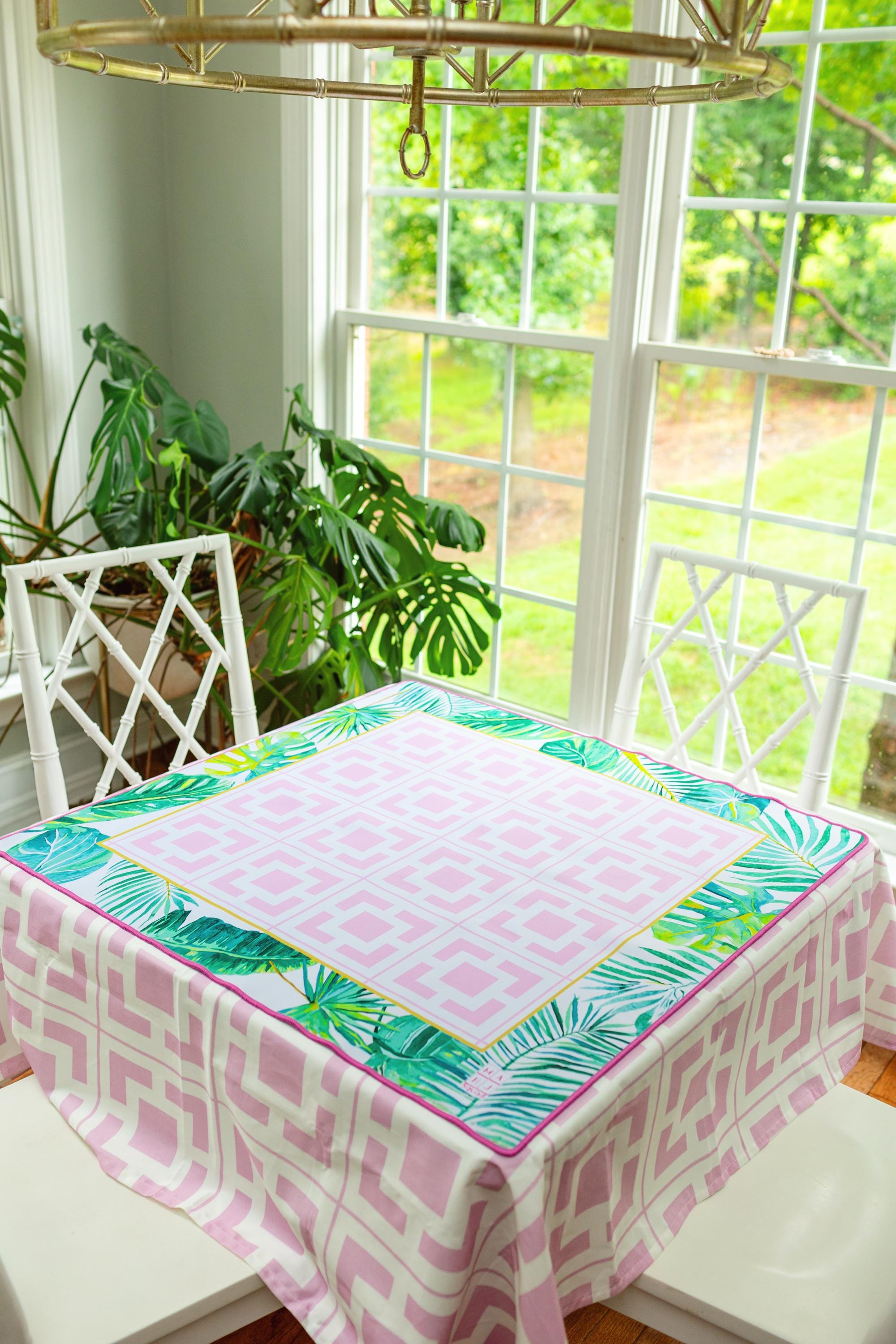 Have your Mahjong Mat reflect your personal style! This style is part of the Palm Springs collection reflecting the tropical mid-century style of Palm Springs, California. The center is reminiscent of the geometric patterns of the Parker Palm Springs architecture, and the border is a variety of tropical palms and monsteras. Edge stitching will be in a bright fun pink.